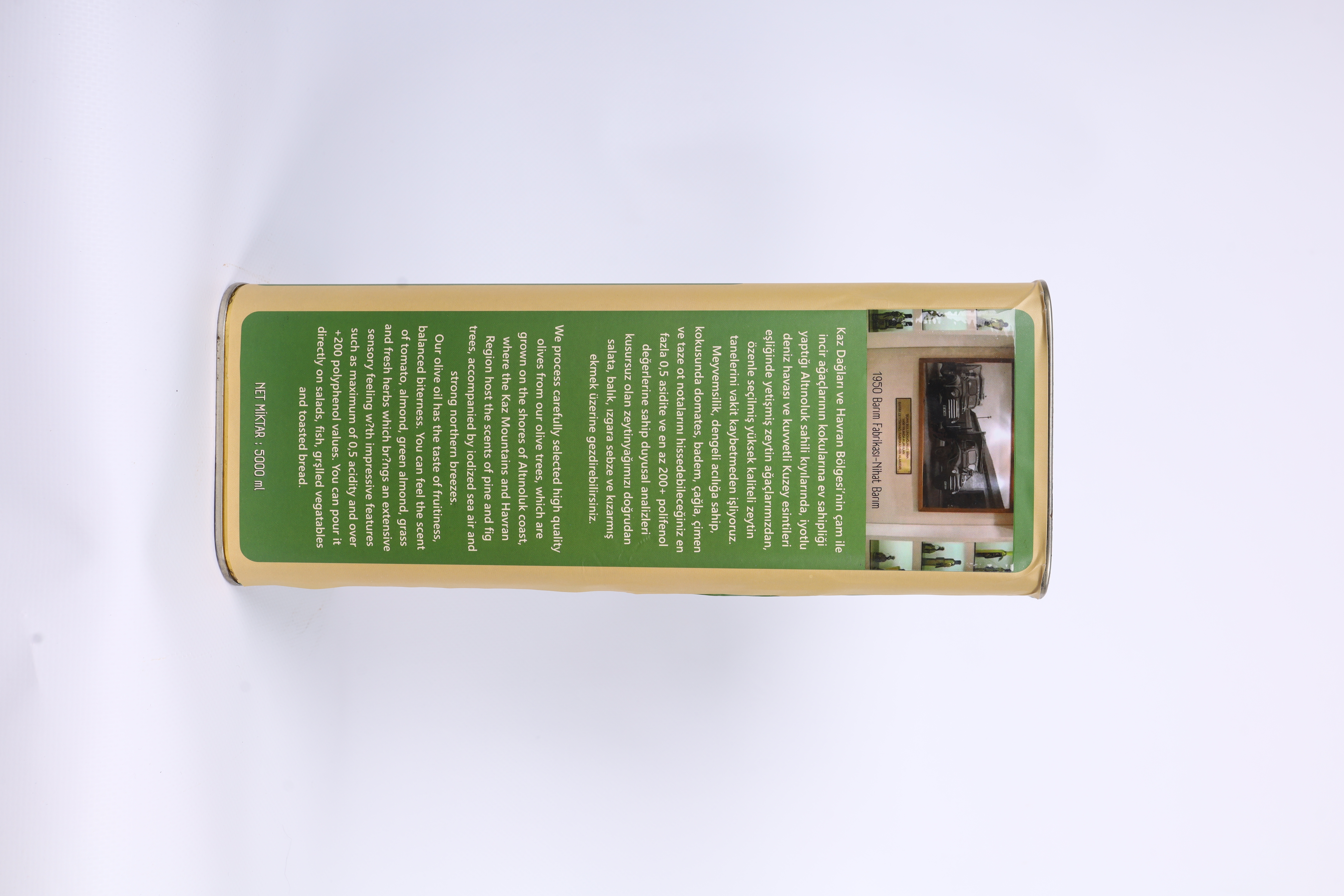 Kaz Dağları ve Havran Bölgesi’nin çam ile incir ağaçlarının kokularına ev sahipliği yaptığı Altınoluk sahili kıyılarında, iyotlu deniz havası ve kuvvetli Kuzey esintileri eşliğinde yetişmiş zeytin ağaçlarımızdan, özenle seçilmiş yüksek kaliteli zeytin tanelerini vakit kaybetmeden işliyoruz. Meyvemsilik, dengeli acılığa sahip, kokusunda domates, badem, çağla, çimen ve taze ot notalarını hissedebileceğiniz en fazla 0,8 asidite ve en az 300+ polifenol değerlerine sahip duyusal analizleri kusursuz olan zeytinyağımızı doğrudan salata, balık, ızgara sebze ve kızarmış ekmek üzerine gezdirebilirsiniz.